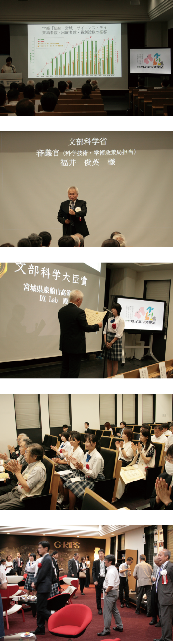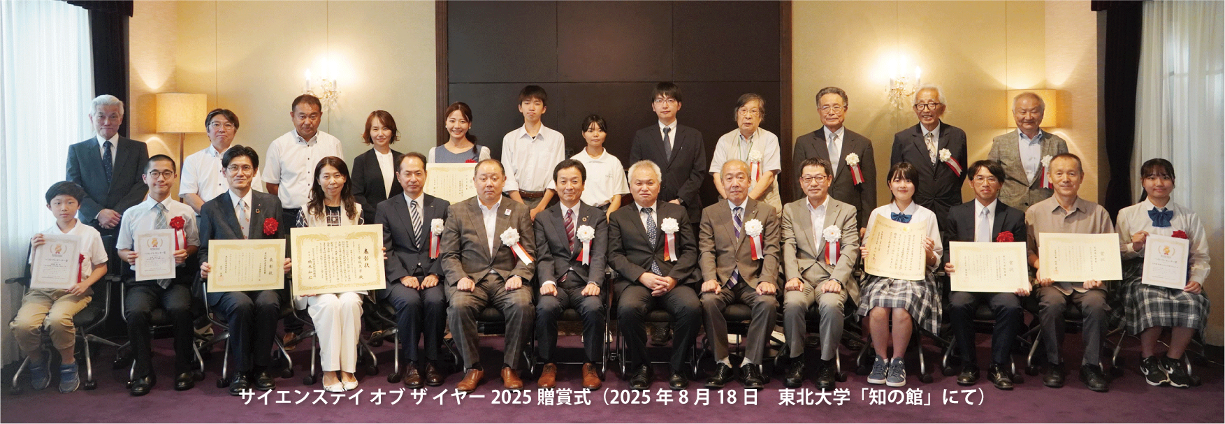 サイエンスデイ オブ ザ イヤー2025贈賞式は8月18日、東北大学「知の館」で開催しました。贈賞式では、主催者として特定非営利活動法人 natural science 理事の大草芳江よりご挨拶及び開催報告を申し上げた後、文部科学省から審議官(科学技術・学術政策局担当)の福井俊英様、JSTから理事の柴田孝博様、東北大学から総長の冨永悌二様(代読:東北大学理事・副学長(教育・学生支援)滝澤博胤様)、東北経済産業局から地域経済部長の古谷野義之様、宮城県から知事の村井嘉浩様(代読:宮城県経済商工観光部産業人材対策課長 熊谷圭太様)、仙台市から経済局長の木村賢治朗様よりご祝辞を賜りました。続いて表彰式では各賞創設者から各受賞者への表彰状の授与が行われ、受賞者が受賞の喜びを語りました。最後に審査員の先生方から各賞についてご講評を賜りました。大変お忙しい中、審査にあたってくださった審査員の先生方に厚く御礼を申し上げます。さらにはご来賓の皆様から公務ご多忙のところご臨席並びに丁重なご祝辞を賜りましたこと、心より御礼申し上げます。受賞された皆様におかれましては心よりお祝い申し上げますとともに、サイエンスデイで実践された科学や技術を社会に伝えるよい方法論をぜひ共有化いただきますようお願い申し上げます。