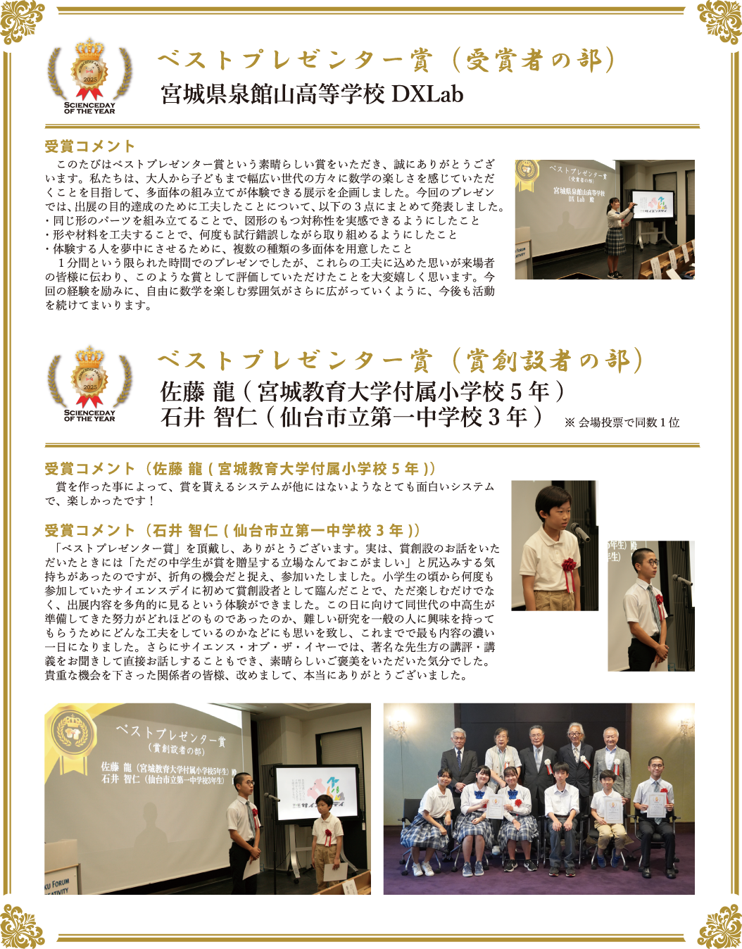3 「宮城県知事賞」の審査は、審査員がサイエンス・デイの出展並びにサイエンス・デイAWARD表彰式でのプレゼンテーション内容を精査し、第4条に規定する審査の基準に基づき、第7条による議決により行う。