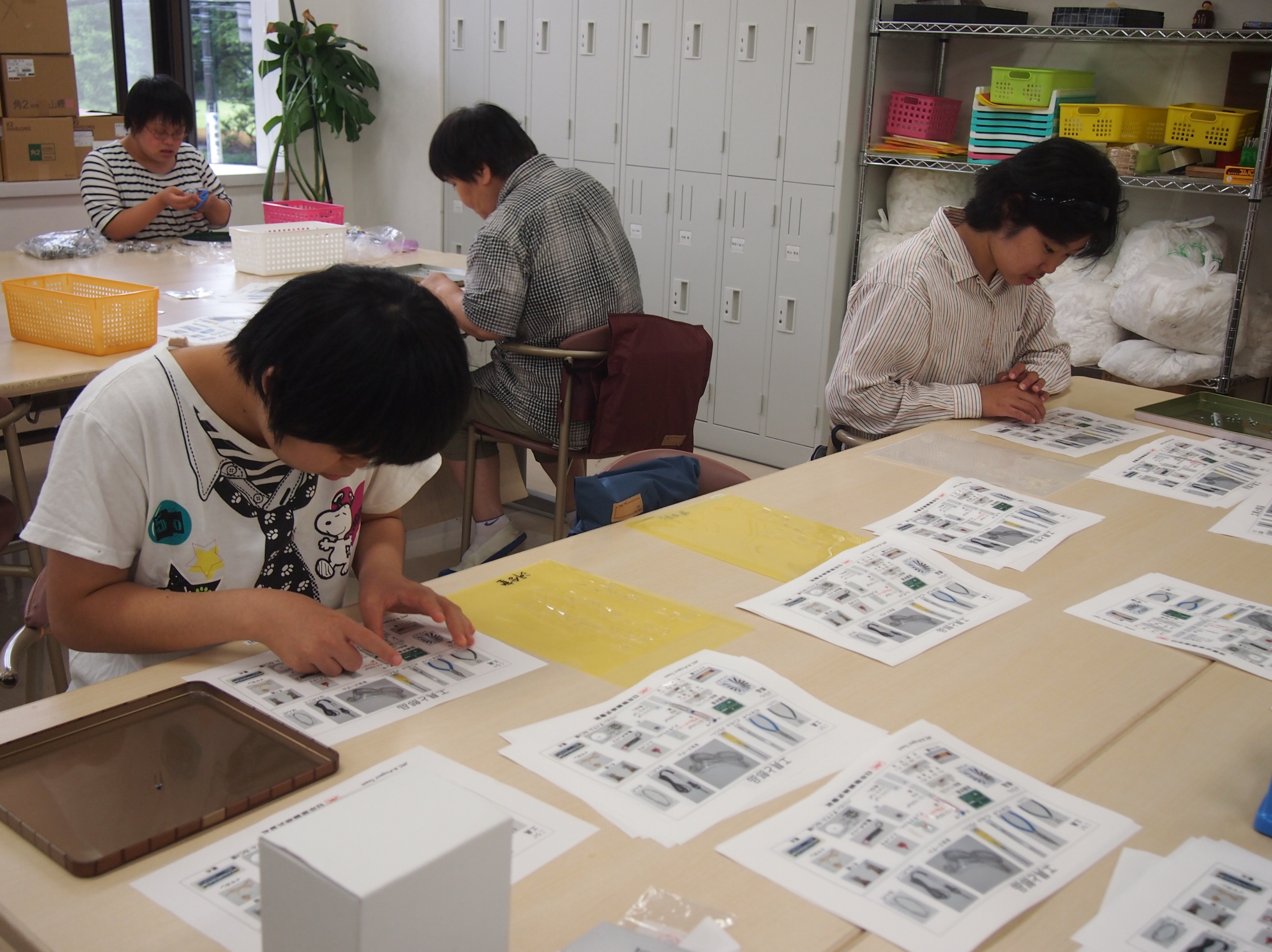 日野にある物流センターから歩いて数分のところに、社会福祉法人東京光の家就労ホームがあります。ここでは子供たちが滞りなく工作ができるよう、準備作業をお願いしております。「小さな部品1つ1つを紙に貼ったり、箱に詰めたり楽しく作業をさせてもらっています」とのコメントを頂いています。