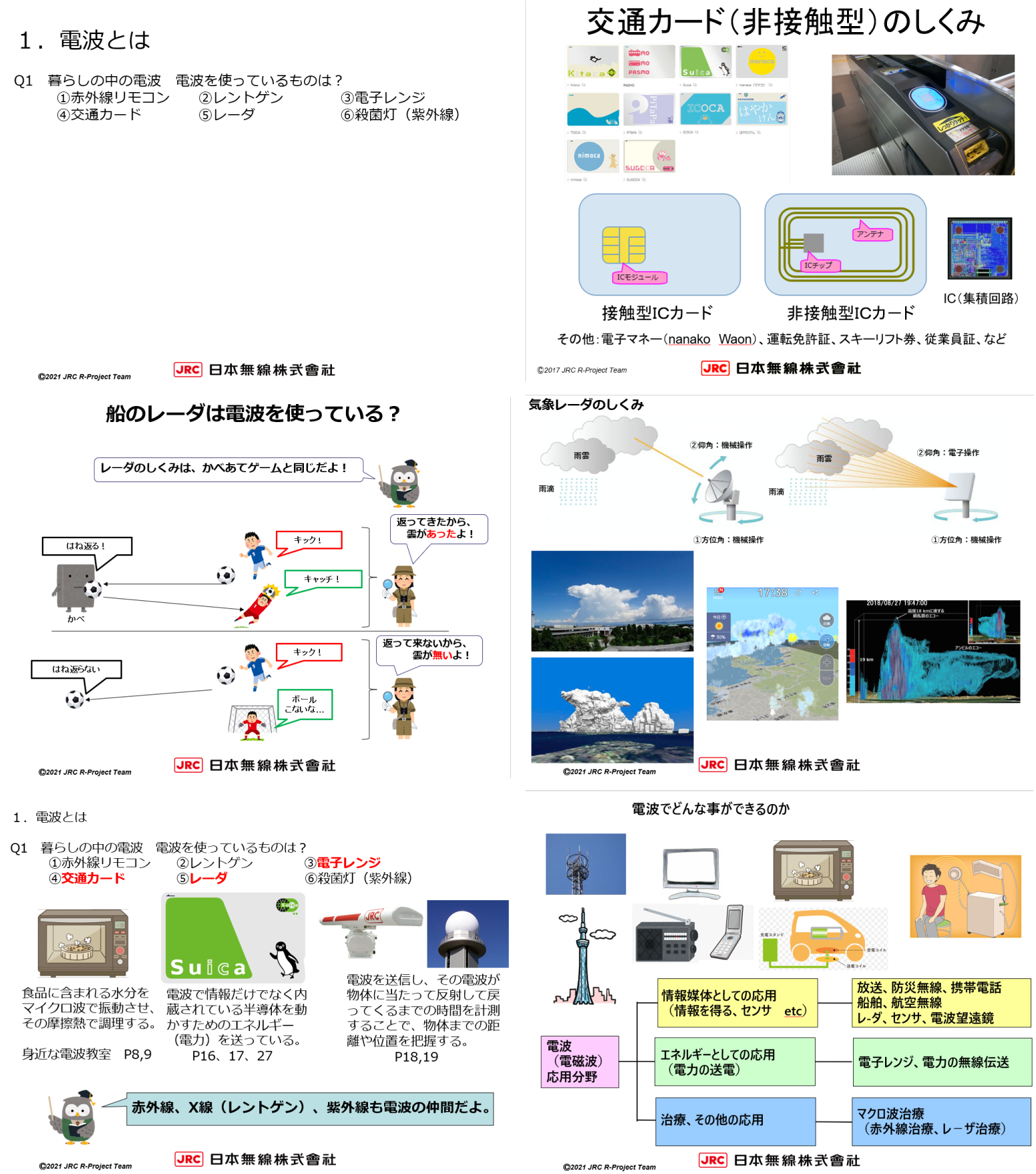 説明する社員により構成は共通ですが、内容には個性があります。電波の身近さと面白さを伝えるにあたり、子どもたちの反応を評価基準として改善しています。私たちの生活の中には、電波を利用した多くの製品があります。電子レンジ、交通系ICカード、レーダー、ラジオなどの事例を取り上げ、クイズ形式で電波の使われ方を学びます。