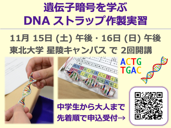 11月は、自分の好きな文字列をコードする塩基配列のオリジナル DNA ストラップ/キーホルダーをビーズ工作で作製する実習を土曜・日曜の午後に対面開催します。生命科学のセントラルドグマと遺伝暗号の仕組みを体験を通して学ぶ半日の実習講座です。