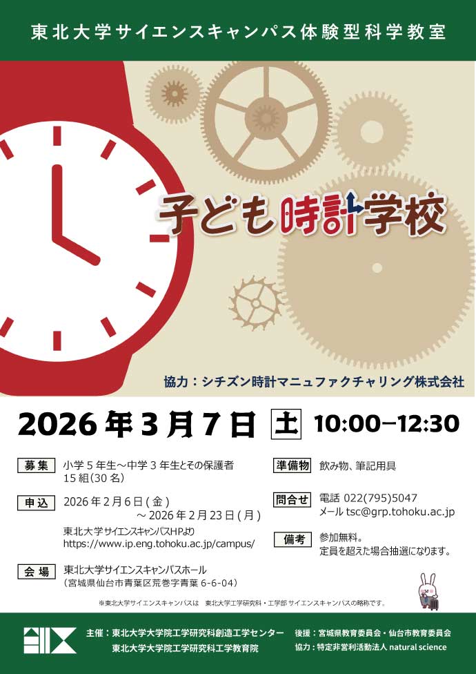 ・会場で撮影した写真、動画等は、シチズン時計マニュファクチャリング株式会社 及び 東北大学の記録、広報等に使用されることをご了解の上、申し込みください。