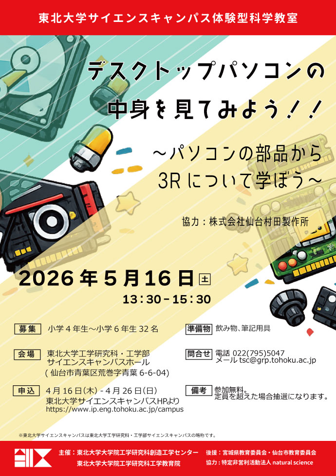 会場で撮影した写真、動画等は、株式会社仙台村田製作所及び東北大学の記録、広報等に使用されることをご了解の上、申し込みください。